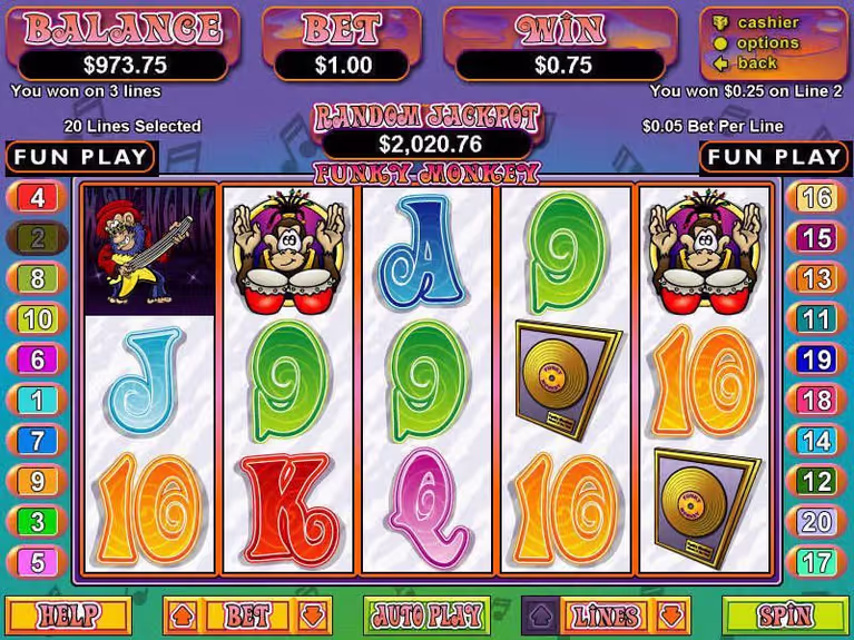 What really gets the energy pumping is the Free Spins Feature, activated by landing three or more Funky Logo scatters anywhere on the reels. You'll score up to 25 free spins, where all your wins get a sweet multiplier boost—making every payout feel like a jackpot hit. This progressive slot also ties into random jackpots that can drop at any time, adding that extra layer of surprise to your session. Imagine watching those musician monkeys celebrate as your balance climbs—it's rewarding and keeps you coming back for more spins.